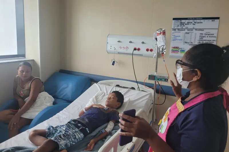 Danilo Souza Teixeira, 9 anos, morador de Soure, na região do Marajó, também recebeu a visita dos capelães, que o abordaram com contação de uma divertida história sobre a importância de as crianças comerem frutas, legumes e verduras, para o fortalecimento do sistema imunológico contra doenças, para evitar adoecimento, é até internações hospitalares. O paciente, que a princípio aparentava desânimo, chegou a sorrir várias vezes durante a contação da história, e no final da visita participou ativamente do momento da Oração pela Saúde. Ele conta o que achou do trabalho dos voluntários.