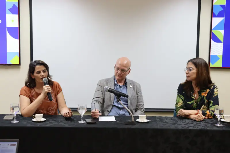 Participaram do evento Alex Carvalho, presidente da Federação das Indústrias do Estado do Pará (Fiepa); Joanna Martin, sócio fundadora da foodtech Manioca; e Camille Bemerguy, secretária adjunta de Bioeconomia da Secretaria Estadual de Meio Ambiente e Sustentabilidade (Semas).