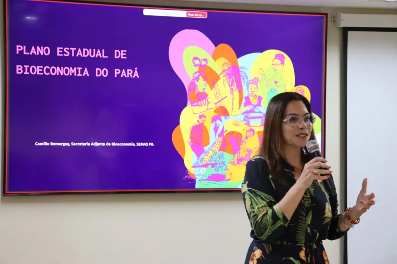 “O governo do Pará foi o primeiro a lançar um plano de bioeconomia no Brasil em 2022. O Estado entendeu que essa era uma agenda necessária para conciliar os desafios da agenda climática e ambiental com a social e econômica. Então, o plano de bioeconomia começou com uma discussão do que é a bioeconomia para o Pará. Isso foi feito a partir de uma discussão multisetorial. Nós tivemos mais de 41 organizações construindo, incluindo indígenas, quilombolas, e ribeirinhos. Queríamos ter diversos olhares, foi um processo de co-construção participativa e multisetorial”, destacou Camille.