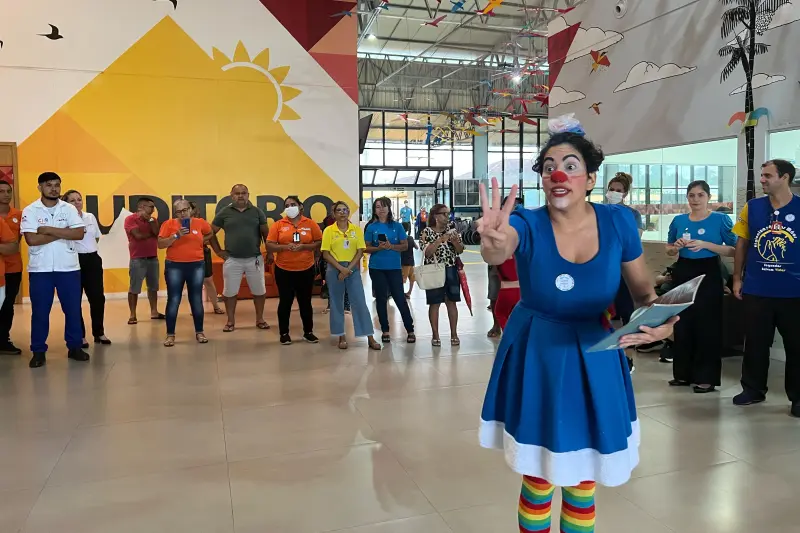 Intervenção artística - Durante a programação, a Palhaça Nanna Chorona, interpretada pela professora de Teatro do CIIR, Paula Barros, realizou uma intervenção lúdica para usuários, familiares e a equipe multiprofissional. A apresentação incluiu a leitura do livro “A pontinha menorzinha do enfeitinho do fim do cabo de uma colherzinha de café”, de Elvira Vigna, abordando, de forma poética, a importância do cuidado com o outro.