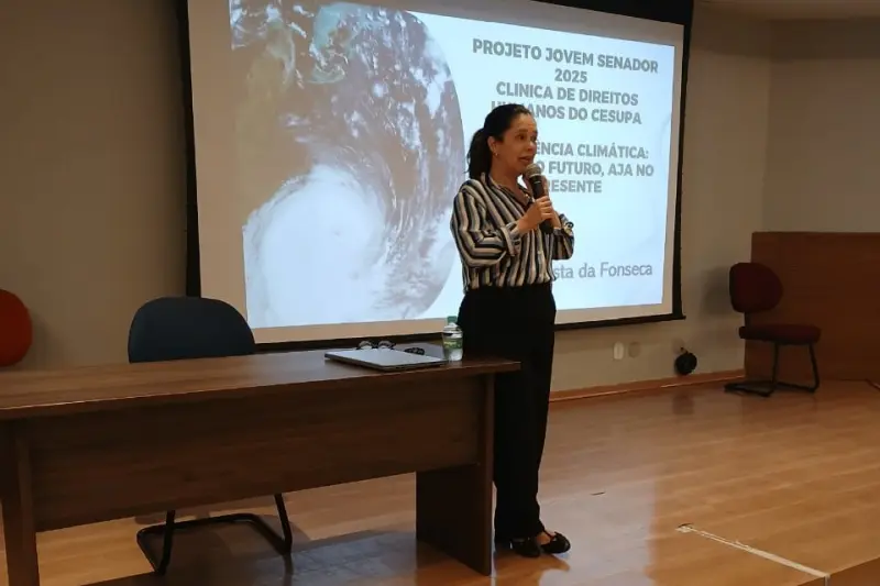 "Trouxemos uma abordagem sobre a Emergência Climática, tema do Programa Jovem Senador, relacionando-o aos tratados internacionais. Esse projeto é relevante porque permite que os alunos da rede pública tenham contato com temáticas de direitos humanos e direito ambiental, enquanto os estudantes da clínica cumprem seu papel social e ampliam seus conhecimentos sobre essas questões", explicou a docente.