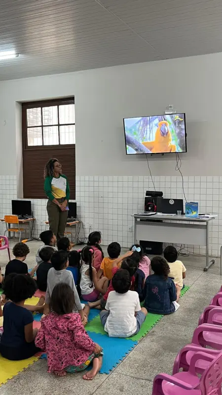 A gerente de Biodiversidade do Ideflor-Bio, Mônica Furtado, conduziu a apresentação para as crianças de 5 e 6 anos. Ela explicou, de forma lúdica e acessível, como o projeto é desenvolvido, os cuidados com as ararajubas e o papel dos animais na manutenção do equilíbrio ambiental. As crianças fizeram perguntas e demonstraram curiosidade sobre as aves símbolo da Amazônia.