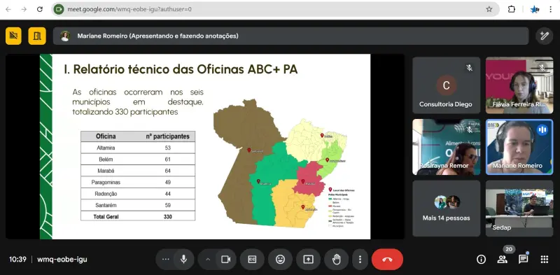Ao longo da reunião, a empresa Agroicone, parceira da Sedap, responsável pela construção do Plano Estadual, apresentou aos integrantes da Câmara Técnica os resultados da 1ª etapa de implementação do Plano ABC+, que foram as oficinas realizadas entre novembro de 2024 e fevereiro de 2025 em: Altamira, Belém, Marabá, Paragominas, Redenção e Santarém.