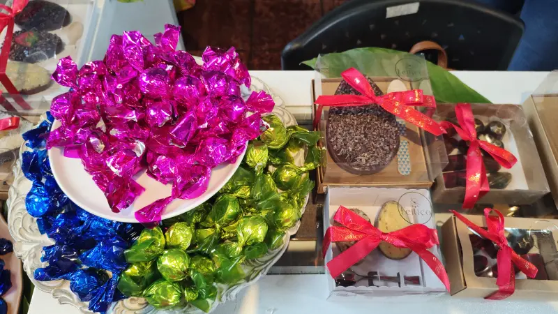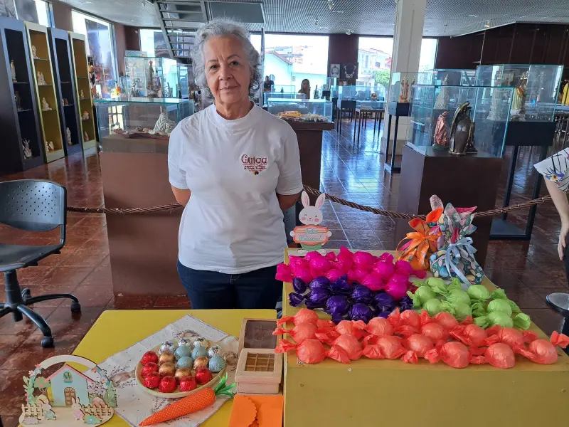 A empreendedora Maria das Graças Frazão, de 69 anos, trabalha com a produção de bombons de chocolates regionais feitos com chocolate de origem desde 1991, e estreia na exposição no São José Liberto.