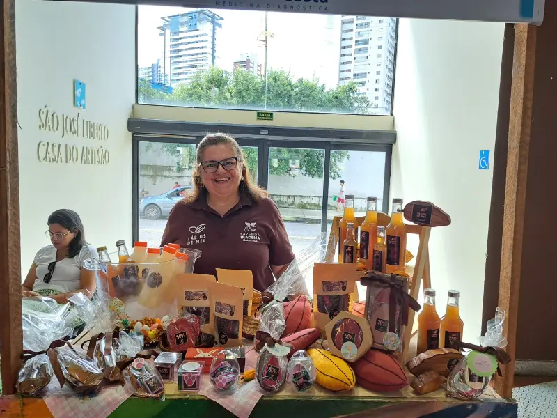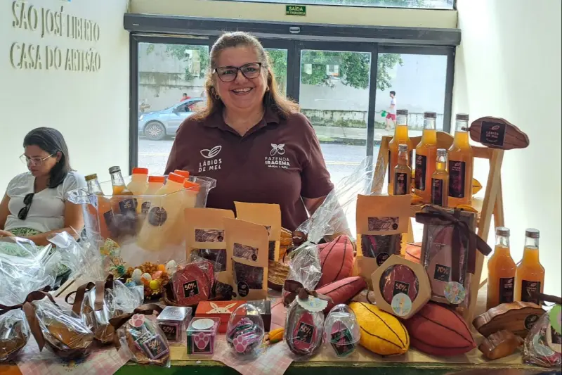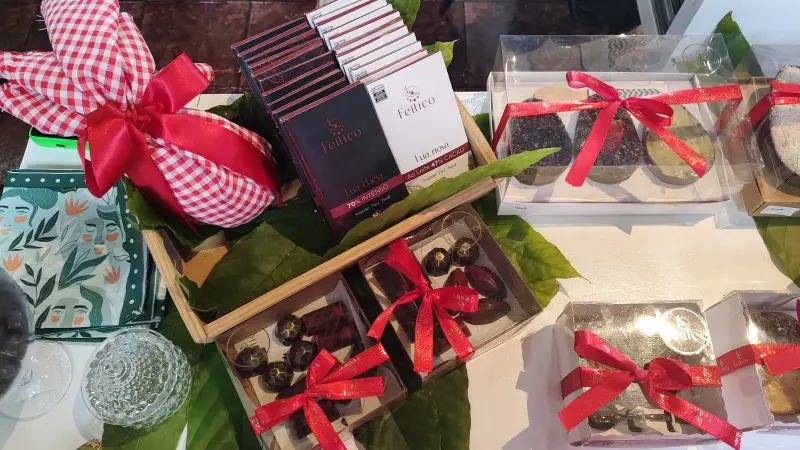 Quem também marca presença no evento é a empreendedora Márcia Nóbrega, representando os produtos da Lábios de Mel. "Trabalhamos com produtos que vão do plantio até o produto final do cacau. Lidamos com diferentes formas do cacau, desde o néctar até o licor, além de chocolates que contêm entre 50% e 70% de cacau. Nosso cacau é cultivado dentro do sistema agroflorestal SAFS, que integra o plantio de banana, cacau e açaí, contribuindo assim para o reflorestamento. Estamos no 11º ano de sucesso, e é gratificante ver que a floresta realmente está se mantendo em pé.