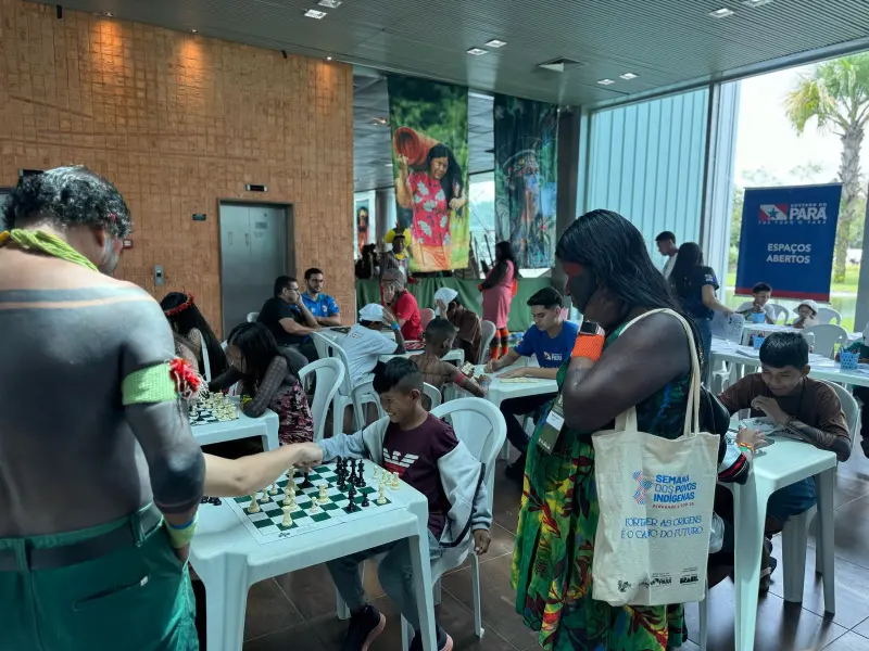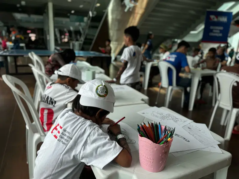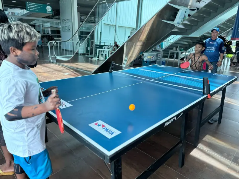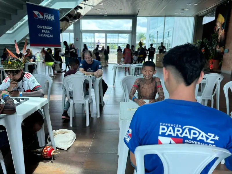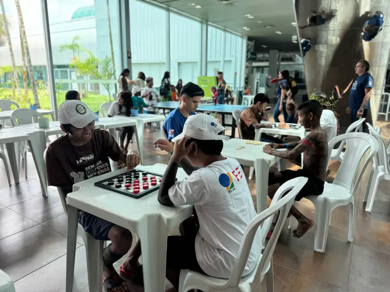 Projeto da Fundação ParáPaz oferece um ambiente acolhedor, com jogos e recreação para crianças indígenas e suas famílias durante evento no Hangar, em Belém