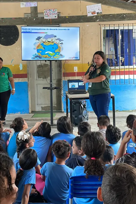A Secretaria de Estado de Meio Ambiente e Sustentabilidade (Semas) realizou, nesta terça-feira (15), palestra sobre educação ambiental para os alunos do 5° ano da Escola Estadual Alexandre Nicomedes da Cunha, no bairro da Cabanagem, em Belém. A ação teve o objetivo de explicar sobre descarte correto de resíduos, consumo consciente e importância da educação ambiental.