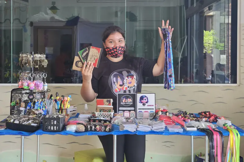 “Essa é minha primeira vez participando aqui e fui muito bem recebida. A feira é uma chance de mostrar o que eu gosto e faço com carinho: caderninhos com capas inspiradas em animes como Naruto, Dragon Ball, One Piece, além de séries como Harry Potter. Tudo é feito à mão, desde o corte até o desenho. Também criei cordões identificadores de deficiências ocultas, a pedido de clientes que sentiam essa necessidade”, contou Ariane, entre atendimentos no estande.