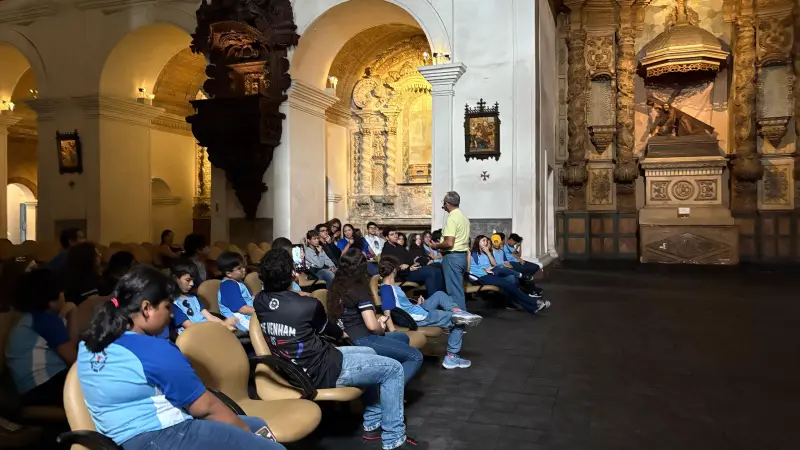 Alunos do 6º e 9º ano da rede particular visitaram o Museu de Arte Sacra, acompanhados pela coordenadora pedagógica Francinete Barros. “Essa experiência permite que as crianças visualizem o conteúdo aprendido em sala e fortalece a construção do imaginário a partir da história paraense”, destacou.