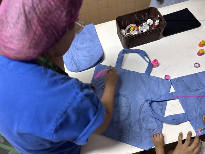 A ação “Cuidando com Afeto” foi idealizada pela Classe Hospitalar do Hospital, em parceria com o Comitê de Humanização. Na ocasião, diversas mulheres participaram da produção e personalização de bolsas, feitas com materiais reutilizáveis.
