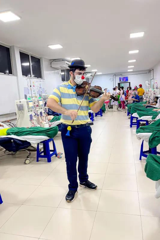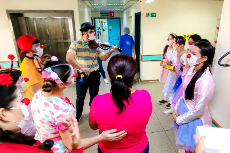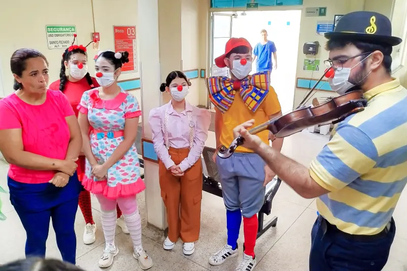 Vestidos com jalecos coloridos e narizes vermelhos, os palhaços encantaram o público com apresentações sensíveis e bem-humoradas. Ao som suave do violino, mesclaram arte e afeto, criando instantes de leveza que emocionaram pacientes, acompanhantes e profissionais de saúde.