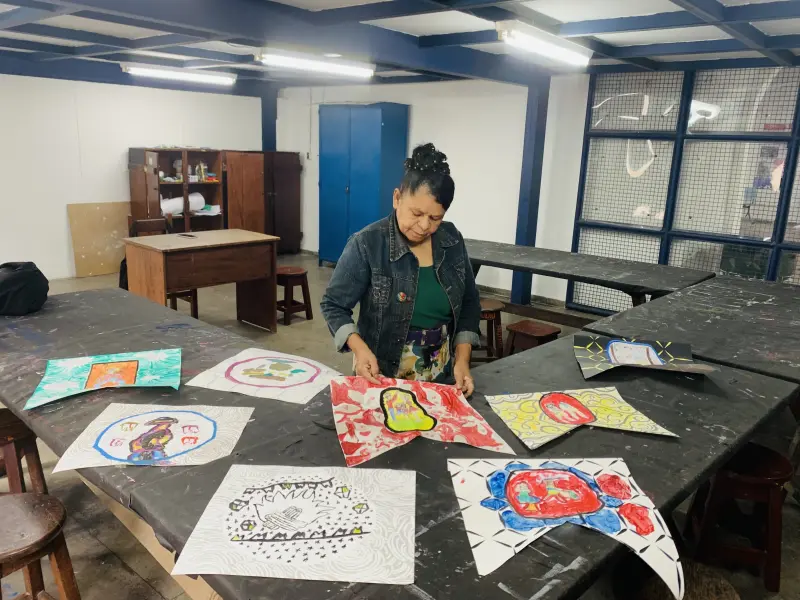 Hoje, com mais de 30 anos de atuação como oficineira, ela é referência em pesquisa com materiais não convencionais, como tecidos sintéticos e plásticos. Seu trabalho artístico — que também é pedagógico — já esteve em galerias, editais e até em Bienais. “O que não serve mais no meu processo criativo, eu transformo em ferramenta de ensino. Ensino o que vivo. Ensinar é plantar e colher. E o retorno vem”, diz com orgulho.