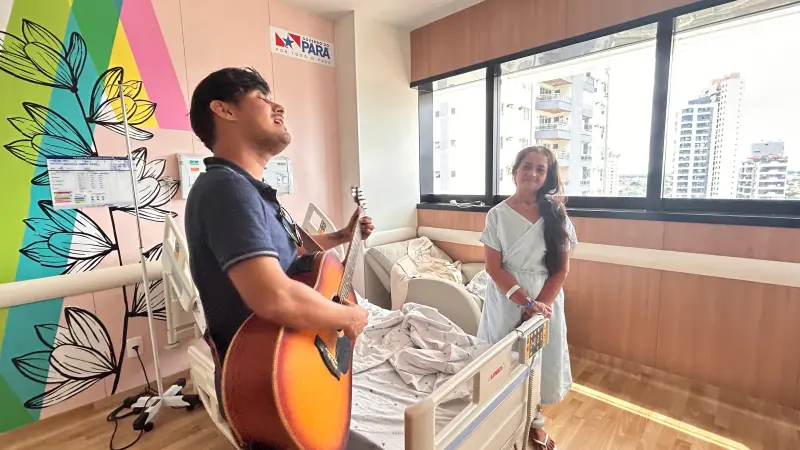 Em alusão ao Dia das Mães, o Hospital da Mulher do Pará (HMPA), unidade vinculada ao Governo do Estado, preparou uma programação especial marcada pela emoção e pelo carinho. A celebração contou com uma apresentação musical organizada por Murilo e Mayara Vidal, filhos de uma paciente internada na unidade, que homenagearam a mãe com um repertório afetuoso de voz e violão, acompanhados por amigos. O momento tocante, ocorrido na última sexta-feira (09), envolveu também outras pacientes e profissionais de saúde da unidade de referência na linha de cuidados femininos.