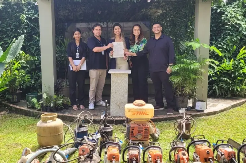 Entre os equipamentos estão motosserras, engraxadeiras, baterias, um gerador de energia, uma motobomba, um pulverizador e sopradores, além de garrafas térmicas, facões, sabres de motosserra, um botijão de gás e uma basqueta.