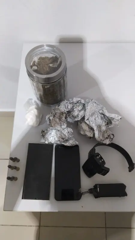 Durante as buscas no interior do veículo e da residência, foram apreendidas seis munições de arma calibre .38, expressiva quantidade de substância entorpecente, um bloqueador de sinal e dois aparelhos celulares envoltos em papel alumínio, além de uma tornozeleira eletrônica danificada.