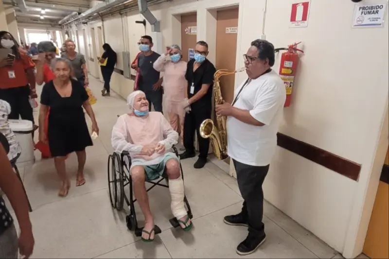 Apresentação de saxofone e brega paraense transformaram a rotina hospitalar e emocionaram pacientes e servidores durante ação de humanização