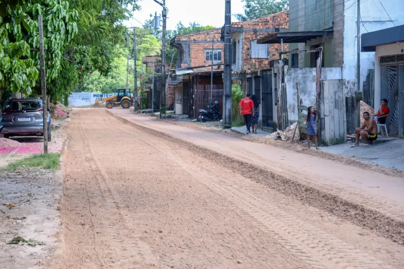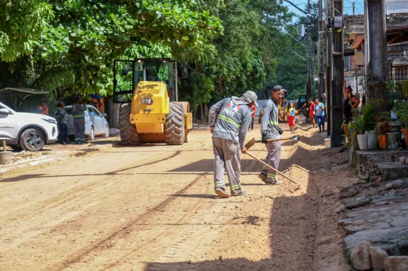 A Travessa Fluminense, entre a Passagem Helena e a Ponte do Canal, está recebendo os serviços de terraplanagem, etapa que antecede o asfaltamento. A autônoma Amanda Ataíde mora no local há mais de 20 anos e comemora a chegada da pavimentação.