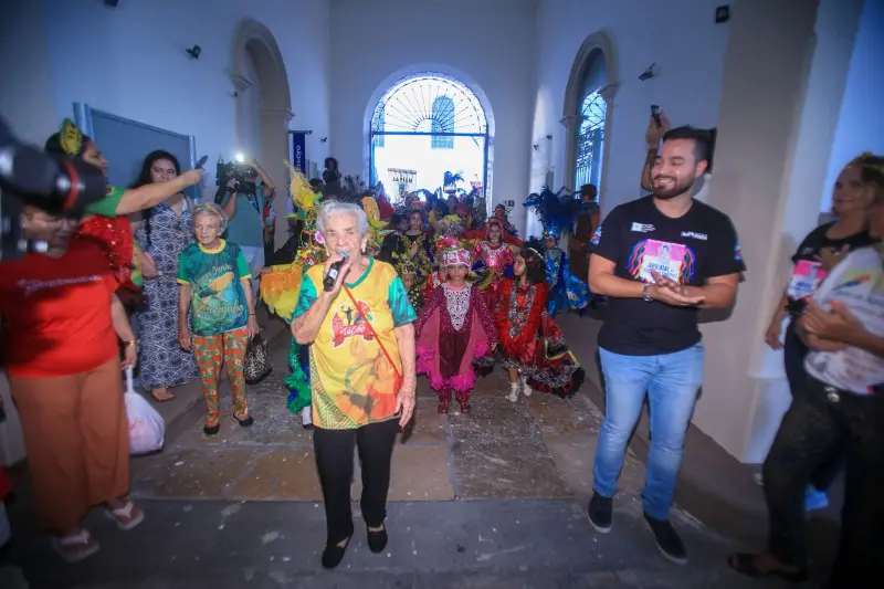 Iracema Oliveira é a responsável pela organização dos grupos e saída do cortejo pelos arredores da Casa das Artes. Ao retornarem para o prédio, no palco, a mestra e o presidente da Fundação Cultural do Pará, Thiago Miranda, fizeram a abertura oficial do Arraial.