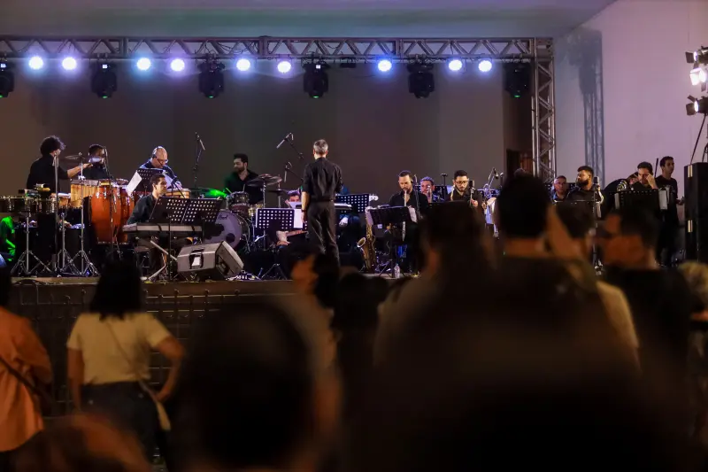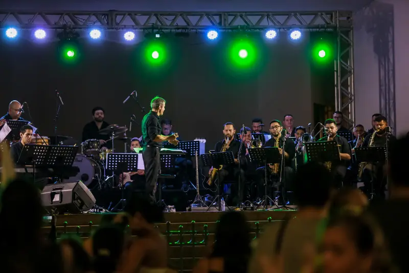 Após a apresentação do Cartaz do Círio 2025 aos fiéis, na Praça Santuário, a Amazônia Jazz Band subiu ao palco da Concha Acústica e colocou todo mundo pra dançar com canções regionais e nacionais em arranjos dançantes sob o comando do maestro Eduardo Lima.