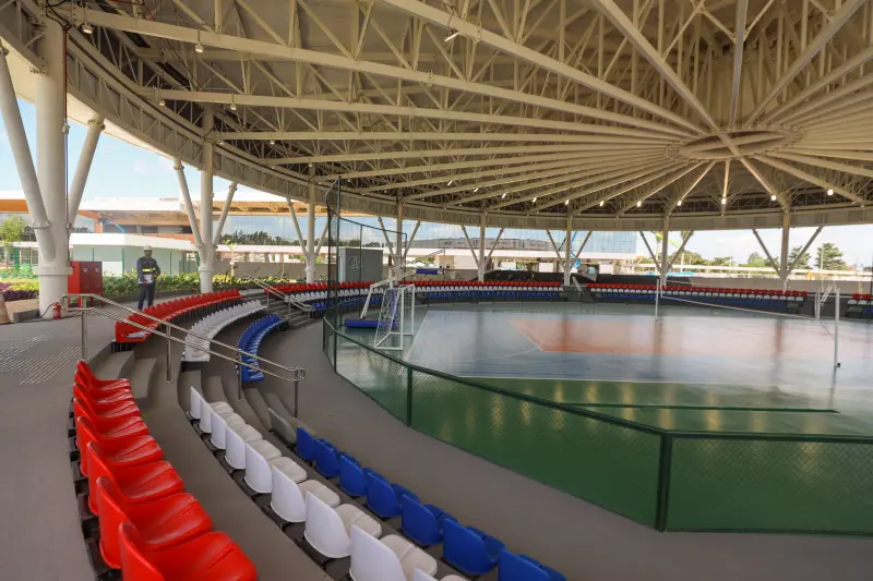 Algumas estruturas continuam em fase de finalização, como a pista de skate e a quadra poliesportiva coberta, que passa pela etapa final de pintura. A quadra contará com cobertura de telha termoacústica, tecnologia que melhora o conforto térmico e acústico, reduzindo a necessidade de climatização artificial e o consumo de energia elétrica. Esse mesmo material também será utilizado em outros prédios do parque, como o Centro Gastronômico e o Centro de Economia Criativa.