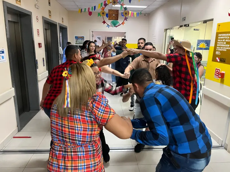 Corredores decorados, bandeirinhas coloridas, comidas típica e ritmos brasileiros invadiram os corredores do Hospital Oncológico Infantil Octávio Lobo (Hoiol), em Belém do Pará. A tradição junina mais uma vez se uniu à solidariedade e transformou a rotina hospitalar em um momento de celebração e inclusão. Durante a terceira edição do concurso Miss e Mister Caipira, iniciativa inserida nas ações de humanização da unidade, foram arrecadados 2.287 brinquedos, que agora vão ‘alimentar’ sonhos e fortalecer o cuidado lúdico com as crianças em tratamento oncológico.