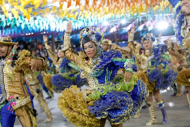 No teatro Margarida Schivasappa, sobem ao palco o Pássaro Japiim e o Cordão de Bicho Borboleta Azul.
