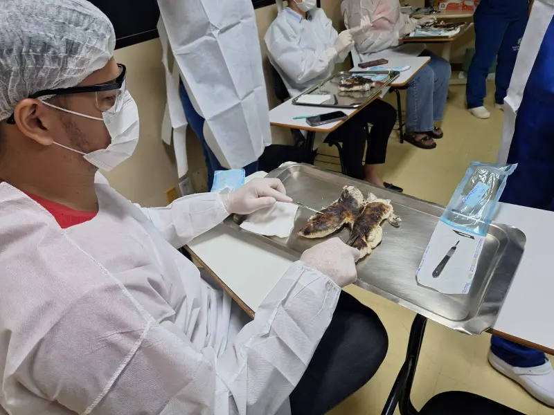 Na parte prática, os profissionais realizaram o desbridamento instrumental em um pé de porco queimado, que foi utilizado como modelo para simular uma pele com necrose. A atividade teve como finalidade demonstrar a técnica de remoção do tecido por meio do uso de pinças e lâmina de bisturi, permitindo o treino em um ambiente controlado.