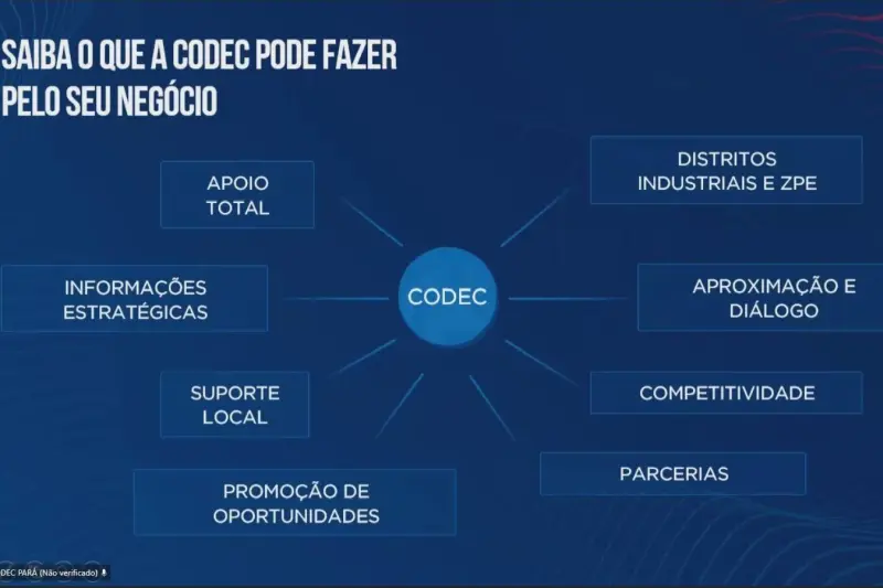 Potencial - A Codec apresentou suas principais iniciativas voltadas à atração de investimentos, estruturação de distritos industriais e estímulo ao desenvolvimento local, com destaque para cadeias produtivas como bioeconomia, agroindústria e energia sustentável. Também foi ressaltada a posição geográfica estratégica do Pará e o potencial da Zona de Processamento de Exportação (ZPE) de Barcarena, voltada à exportação para Europa, Ásia e América do Norte.