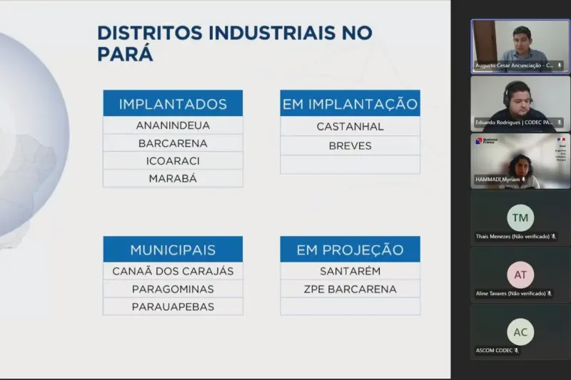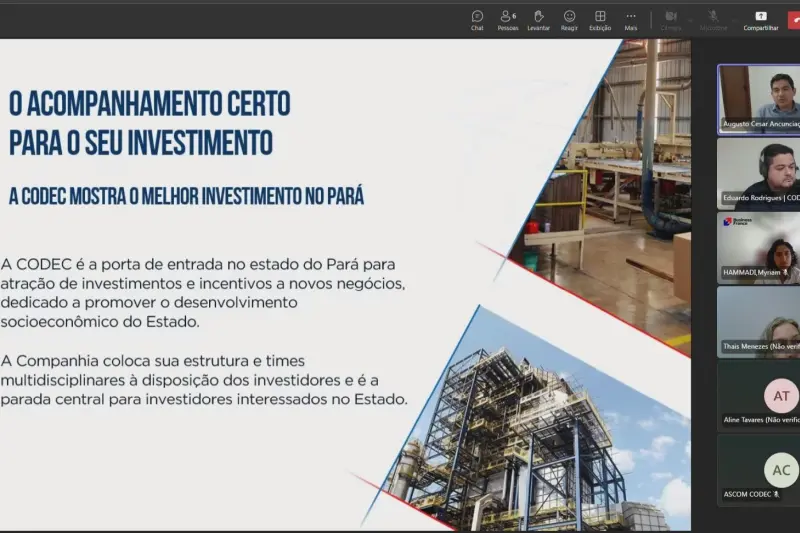 O Governo do Pará, por meio da Companhia de Desenvolvimento Econômico (Codec), realizou nesta segunda-feira (7) reunião on-line com a Business France - agência oficial do governo francês voltada à internacionalização de empresas e à promoção de investimentos estrangeiros. O encontro contou com a participação da gerente de Projetos Agropecuários da instituição, Myriam Hammadi, e marcou uma nova etapa na relação institucional entre a Codec e a Business France, iniciada em 2016, com ênfase no setor logístico.