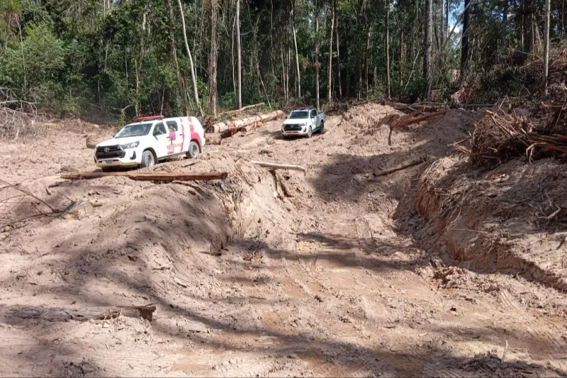 A operação começou às 7h30, com deslocamento das equipes até uma vicinal, no KM-40 da Rodovia PA-370, sentido Uruará-Santarém. A cerca de 20 km da via principal, as guarnições constataram a prática ilegal de desmatamento, com extensas áreas de floresta devastadas, pátios de armazenamento de toras e trilhas abertas para retirada de árvores de grande porte e valor comercial.
