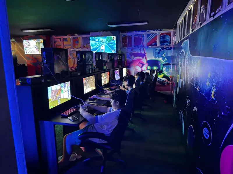 Durante a Colônia de Férias, os participantes têm acesso a mais de 10 jogos, entre eles Valorant, eFootball, Roblox, Counter-Strike (CS) e League of Legends (LoL), além de jogos retrô nos fliperamas.