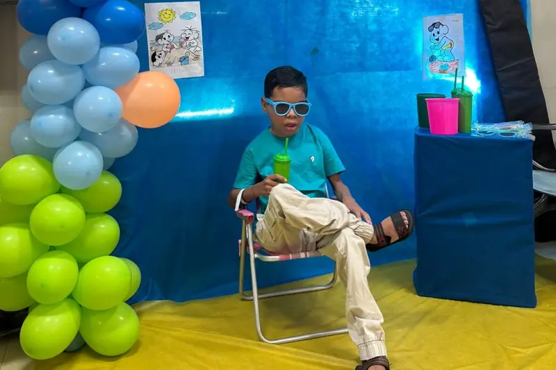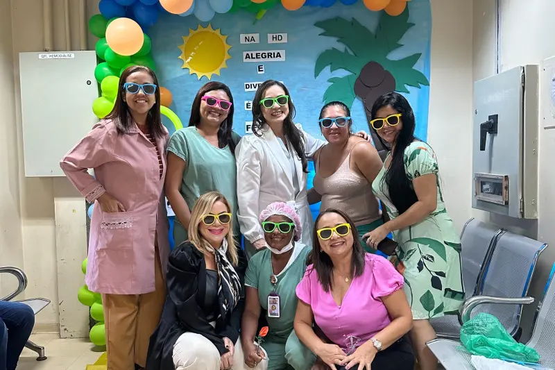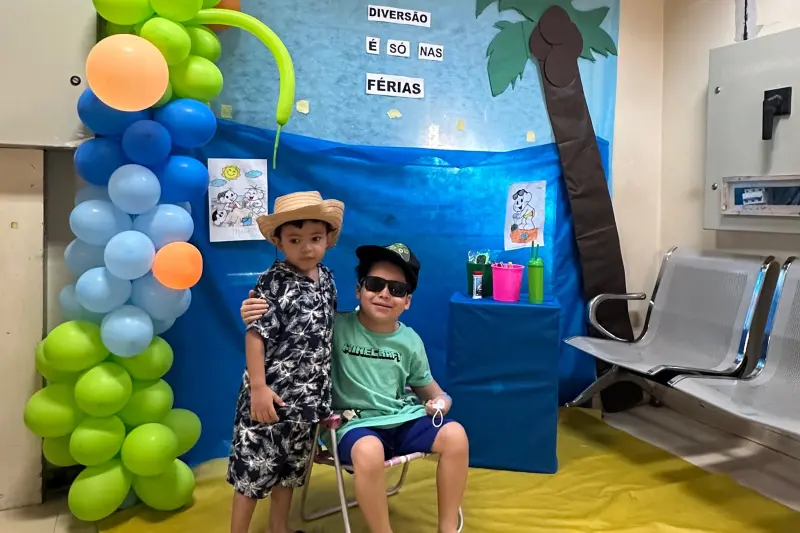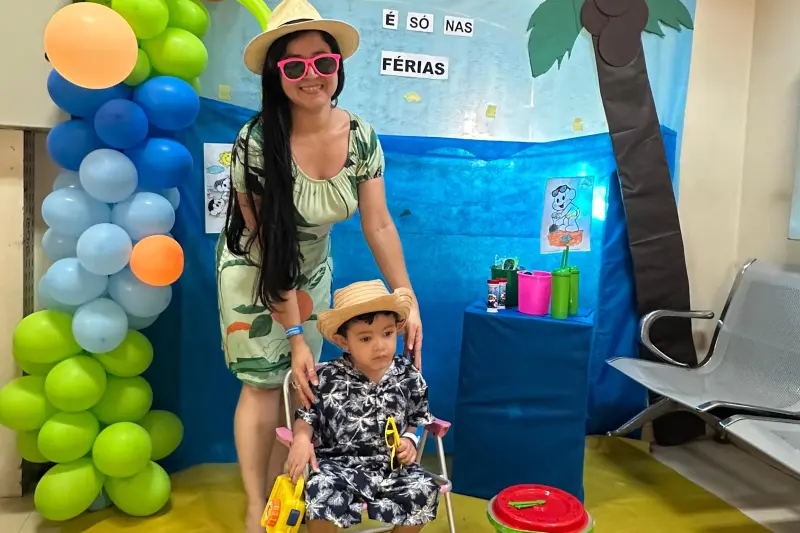 Por conta do tratamento que requer sessões regulares de diálise durante a semana, as crianças em tratamento renal, não têm um período de férias livre, e por isso a terapia ocupacional, junto com as demais áreas profissionais do serviço, montou um cenário de verão para que meninas e meninos pudessem fazer fotos com o tema de um passeio à praia.