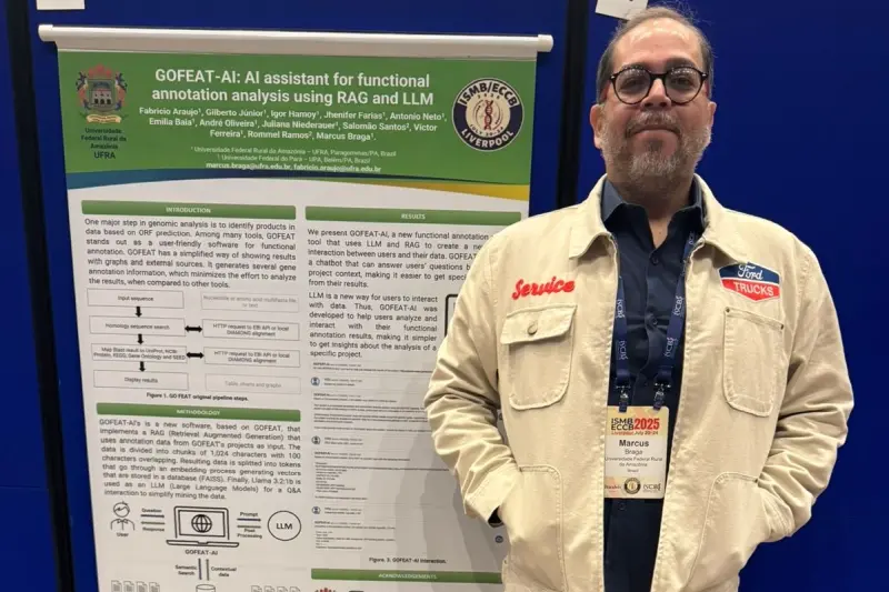 Na oportunidade, os cientistas apresentaram no evento o “GOFEAT-AI: AI assistant for functional annotation analysis using RAG and LLM”, uma ferramenta de análise de anotação funcional que utiliza técnicas de inteligência artificial (IA) generativa para criar uma forma de interação entre usuários e seus dados.
