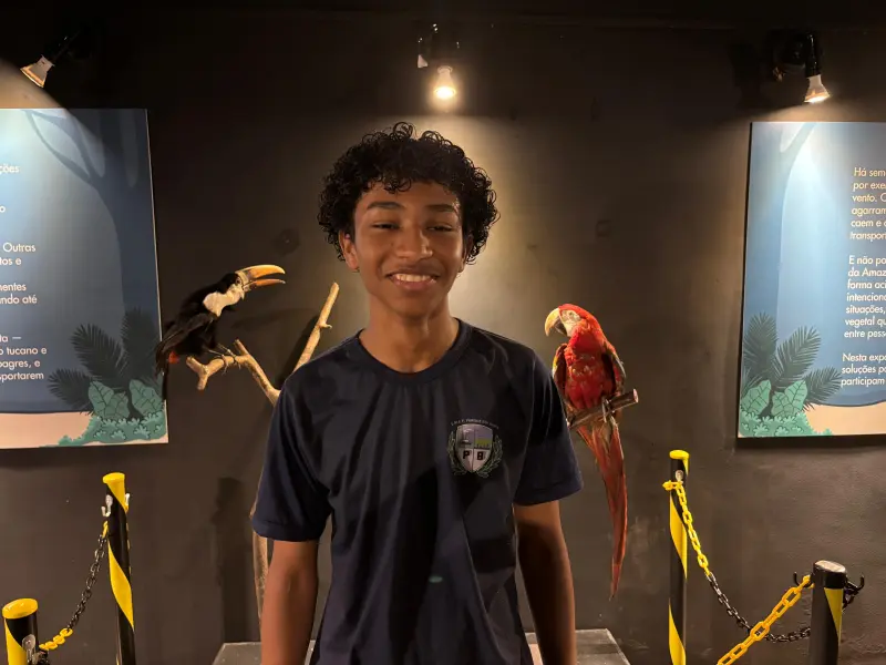 O estudante Eros Gabriel Vilhena, de 14 anos, se encantou com as aves apresentadas na exposição. Ele visitou a mostra na manhã da última sexta-feira, 25, junto à turma do 9º ano da Escola Municipal de Ensino Fundamental Parque Bolonha, de Belém. “Eu gostei dos animais, principalmente das aves. Achei bacana poder vê-las de perto”, comentou.