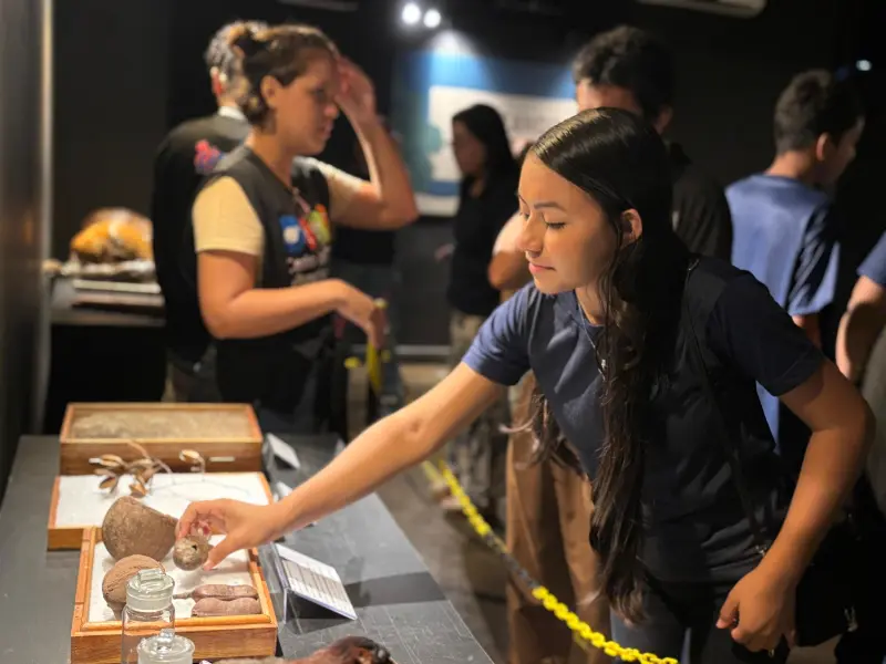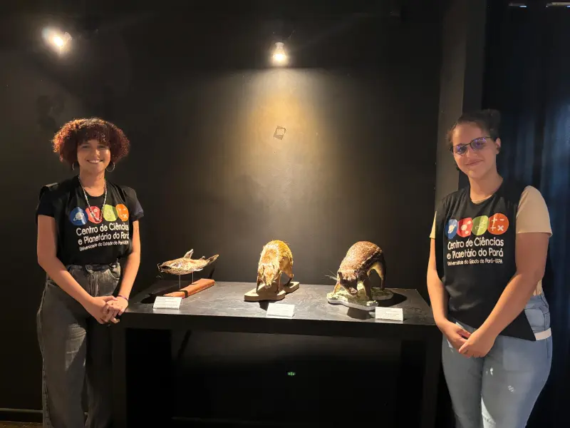 As estagiárias da área de Biologia, Giselly Leitão e Rapahela Conde, são monitoras do Centro de Ciências e Planetário do Pará e costumam apresentar a exposição “Semeando a vida: como ocorre a dispersão de sementes na Amazônia". Os animais em exposição são o principal atrativo para o público, segundo Raphaela. “O que atrai mais os visitantes são os animais, principalmente a anta, que costumam perguntar se é adulta ou filhote. A arara, o tucano e a cotia também chamam a atenção. Eu explico como ocorre a dispersão de sementes – seja por meio dos animais, do vento ou da água – utilizando exemplos como o buriti, o algodão e a semente de samaúma. Também gosto de explicar sobre a dispersão feita por humanos, como, por exemplo, por meio da castanha-do-Pará e outras sementes”, detalha.
