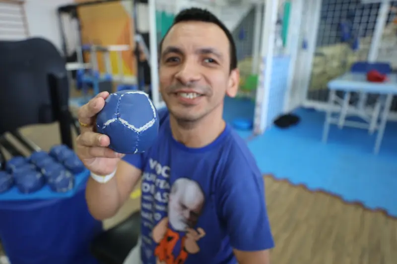 Alesson Ribeiro, 35 anos, usuário com paralisia cerebral, é um dos 40 participantes das turmas de esportes adaptados. Há dois anos, os profissionais do CIIR encontraram na bocha uma oportunidade de estimular o tônus muscular, o equilíbrio corporal, o controle de tronco, a coordenação motora e a noção espacial de Alesson.