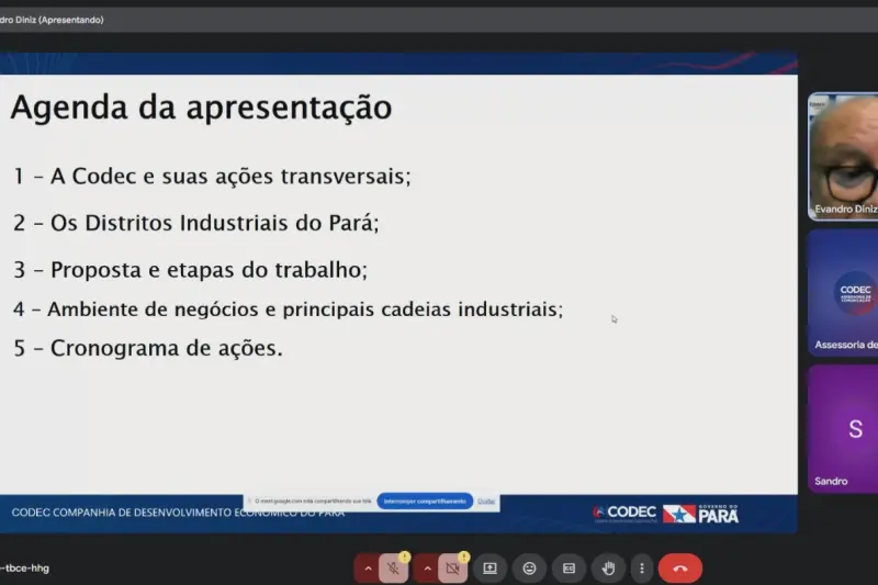 Durante a reunião on-line com representantes da Prefeitura de Bragança, a Codec apresentou os eixos do plano de trabalho que será desenvolvido de forma integrada com o poder público municipal. As ações incluem o mapeamento de oportunidades econômicas, estímulo ao empreendedorismo, fortalecimento das cadeias produtivas, melhoria do ambiente de negócios e elaboração do Guia do Investidor de Bragança.