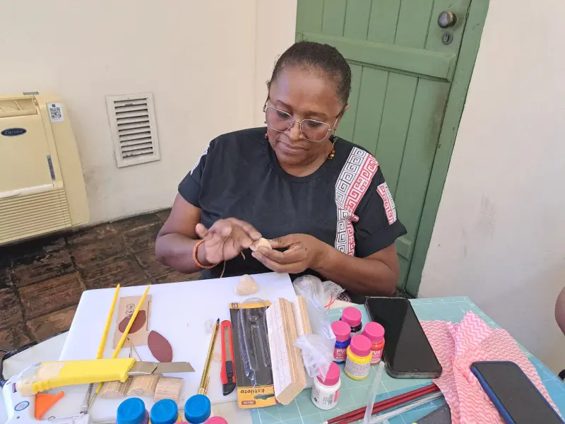 A artesã Ana Lúcia Varela, de 52 anos, atua há mais de três décadas no artesanato, com foco na criação de placas afetivas com frases motivacionais. As peças são feitas com madeira reutilizada, recolhida de canteiros de obras — uma forma de dar novo significado a materiais descartados.