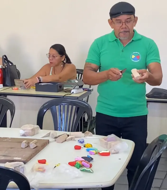 Sob a orientação do artesão Josias Plácido Alcântara Silva, o Mestre Pirias — natural de Abaetetuba, cidade reconhecida como capital mundial do brinquedo de miriti — os participantes aprenderam técnicas de manuseio da fibra, incluindo cortes a laser, pintura, lixamento, montagem e customização das peças.