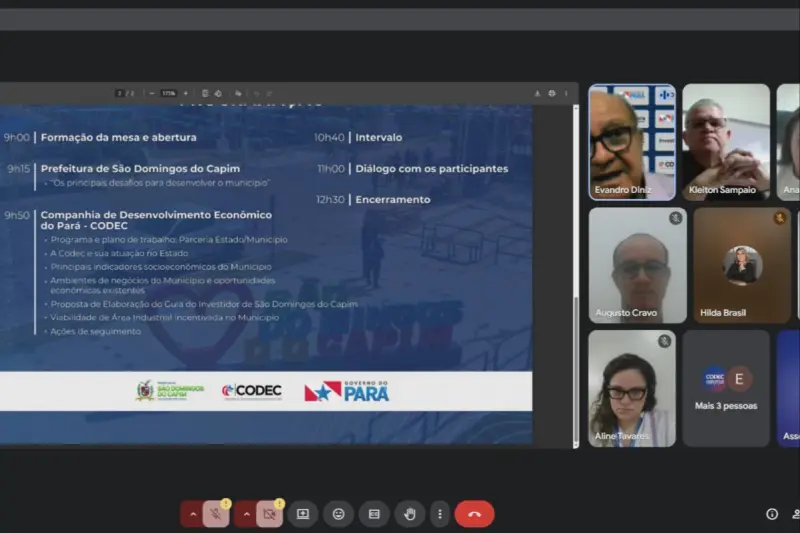 Com o objetivo de impulsionar o desenvolvimento econômico de São Domingos do Capim, a Companhia de Desenvolvimento Econômico do Pará (Codec), em parceria com a Prefeitura Municipal, avançou nesta quarta-feira (6) na organização do Seminário de Desenvolvimento Econômico que será realizado no município. A reunião virtual definiu o formato e a data do evento, que está previsto para ocorrer no dia 10 de setembro, das 9h às 13h. O local será confirmado nas próximas semanas.