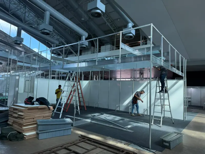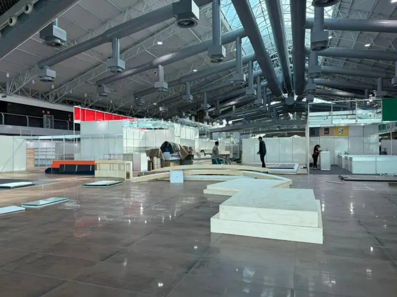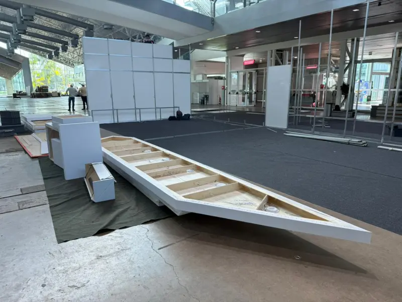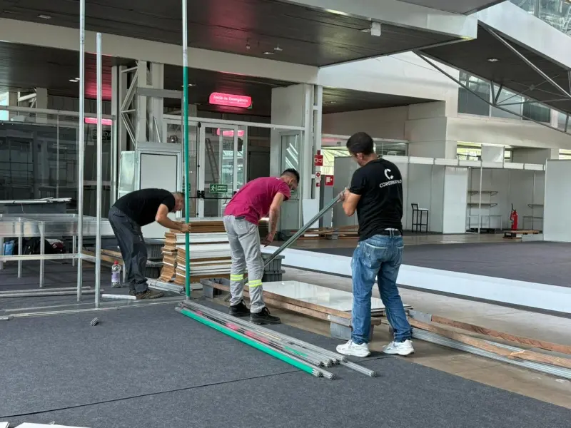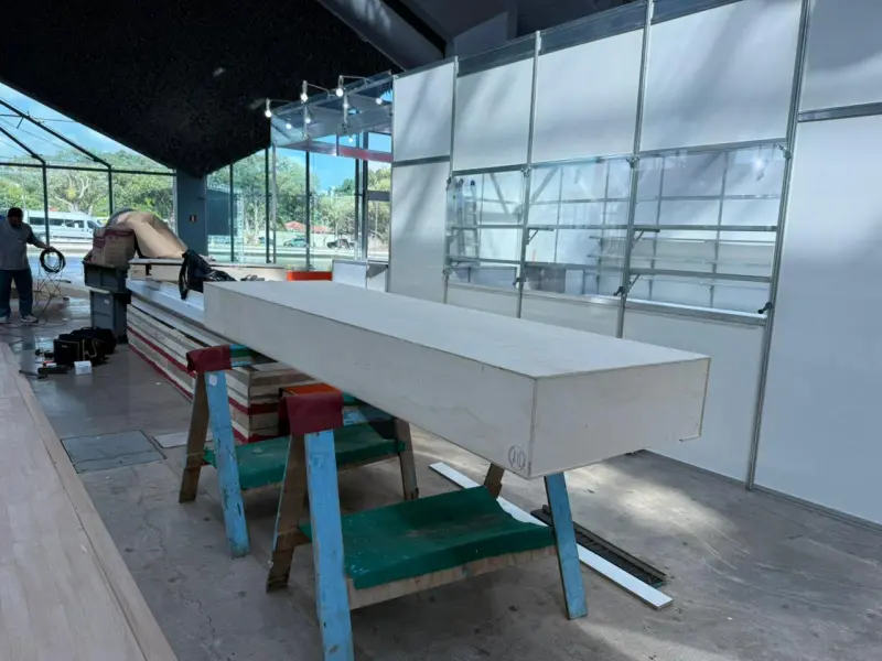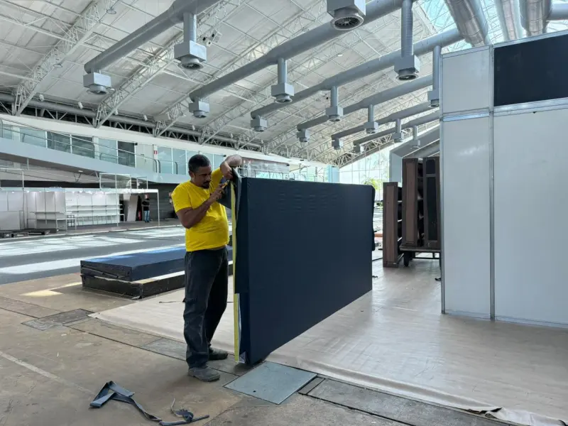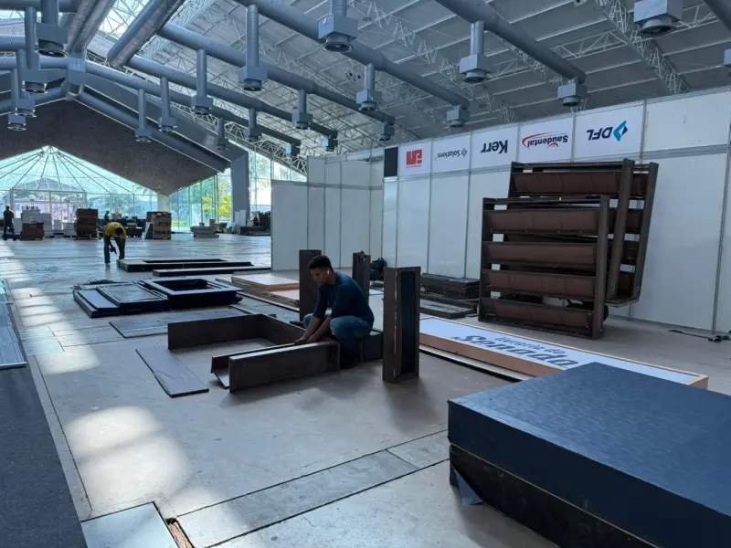 Rodolfo explica que durante a montagem, que iniciou na terça-feira (12) e segue até sexta-feira (15) no Hangar, a equipe prioriza o uso de materiais já disponíveis e de longa durabilidade.