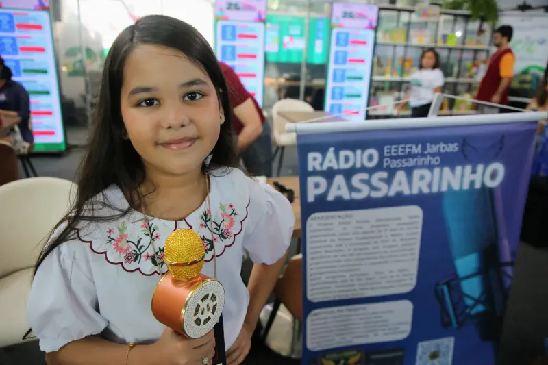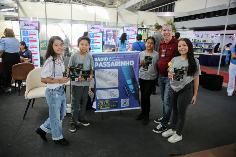 Os estudantes do 5º ano do Ensino Fundamental da Escola Estadual Jarbas Passarinho, em Belém, apresentaram o projeto de podcast “Rádio Passarinho”, uma proposta pedagógica que visa integrar práticas educativas ao uso de ferramentas de comunicação para proporcionar uma experiência formativa que alia os conteúdos curriculares à expressão criativa e ao protagonismo estudantil. Para a Feira, os estudantes produziram um podcast sobre temas relacionados à COP 30.