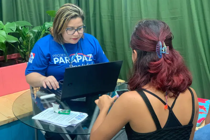 Acesso à emissão de documentos - Neste ano, a Fundação ParáPaz trouxe como novidade o projeto ‘Balcão Cidadão’, que garante a emissão de 2ª via de documentos, como CPF, Carteira de Trabalho Digital, Título de Eleitor, NIS, Cartão SUS, entre outros. O serviço do ID Jovem tem sido o mais procurado durante a programação. Para emitir os documentos, é preciso ter conta no Gov.br. Quem ainda não tiver, pode levar RG, CPF e o celular para recuperação de senha, como explicou a servidora Tânia Torres.