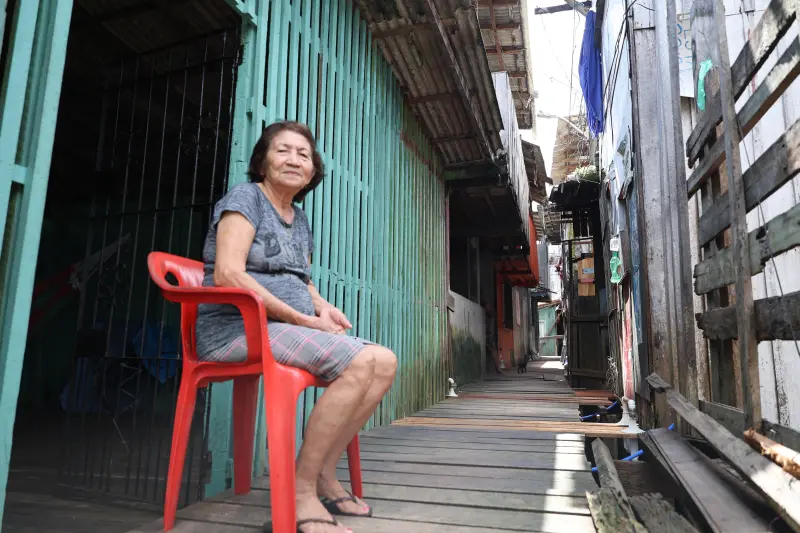 Da porta de casa, dona Leonor Cardoso, de 76 anos, vê o movimento de operários entre as palafitas na Vila da Barca. Ela vive aqui há mais de 60 anos e fala da felicidade em ver o investimento chegando para a comunidade. “A gente espera coisa boa pra nós e Deus mandou essa oportunidade. Eu tô muito feliz!”, disse a aposentada.