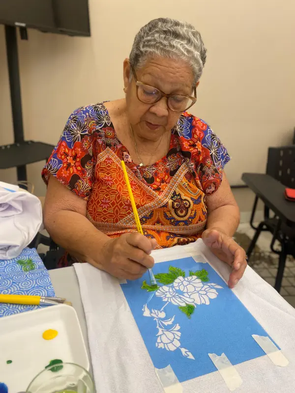 Durante as aulas, os participantes aprenderam a aplicar a técnica do stencil — moldes vazados em acetato recortado a laser — combinando esse recurso com práticas artísticas e soluções criativas. Segundo a artista Celeste Heitmann, esse método democratiza o acesso à arte e permite que os tecidos sejam personalizados com uma ampla gama de formas e desenhos, tornando o processo de criação mais dinâmico e acessível.
