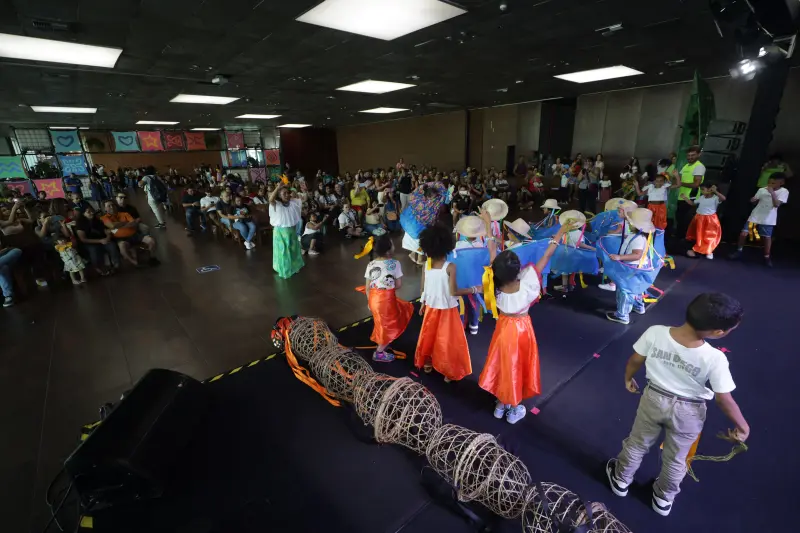 Durante todos os dias da 28ª Feira Pan-Amazônica do Livro e das Multivozes, centenas de alunos e professores visitam o espaço. Na Arena Multivozes, todas as manhãs são dedicadas às apresentações escolares. Nesta quarta-feira (20), as professoras Elaine Casseb e Eléa Diniz, da Unidade Pedagógica Solar da Acalanto, acompanharam turmas do Jardim 1, em uma apresentação voltada para tradições juninas.