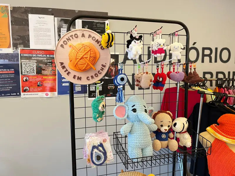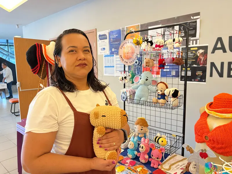 Terapia - A técnica em enfermagem Maressa Assunção encontrou no crochê a terapia ideal para superar crises de ansiedade, principalmente durante e após o período da pandemia de COVID-19. Desde janeiro, ela se dedica somente ao crochê e para a feira trouxe chaveiros, bolsas e diversos artigos. “Além da venda, ganhamos clientes, porque entregamos o nosso cartãozinho. Então, é um espaço muito bom de divulgação”, disse.