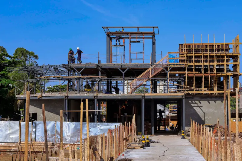 Atualmente, estão em andamento serviços de armação e concretagem da passarela, instalação da cobertura, alvenaria do segundo pavimento, reboco interno e externo do primeiro pavimento, estrutura de concreto para o elevador e instalações elétricas e hidráulicas.