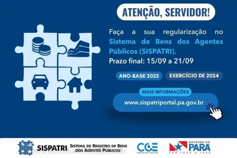 A Controladoria-Geral do Estado (CGE-PA) reabriu o prazo para que os servidores públicos do Executivo Estadual com pendências no Sistema de Registro de Bens dos Agentes Públicos (Sispatri), referentes ao exercício de 2024 (ano-base 2023), realizem a regularização na plataforma, no período de 15 a 21 deste mês.