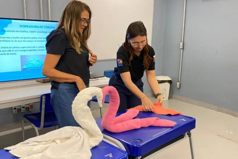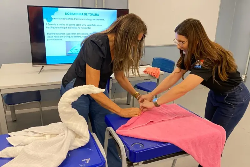 Para Patrícia Nascimento, 47 anos, uma das participantes da oficina, o curso de hotelaria representa uma oportunidade essencial para sua trajetória profissional. Embora atue na área da estética, Patrícia sempre teve afinidade com organização de ambientes, comunicação e postura — habilidades fundamentais para quem trabalha diretamente com o público.